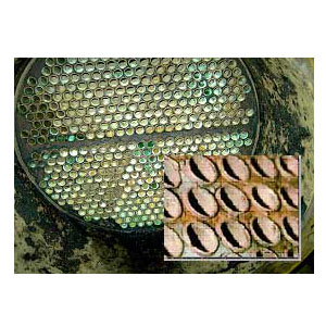 故障現(xiàn)象:海水面管板腐蝕析碳,將管板清干凈,發(fā)現(xiàn)很長一截銅管裸露在外。