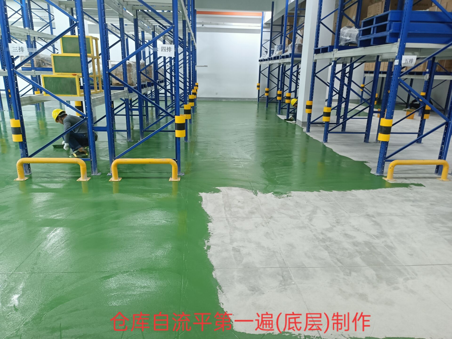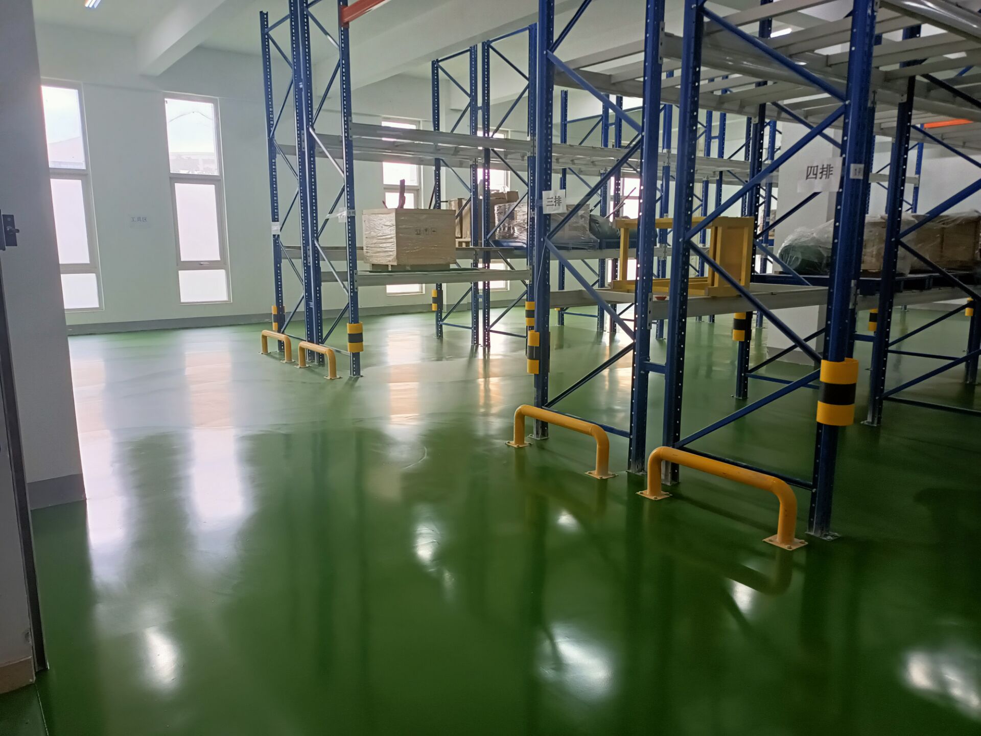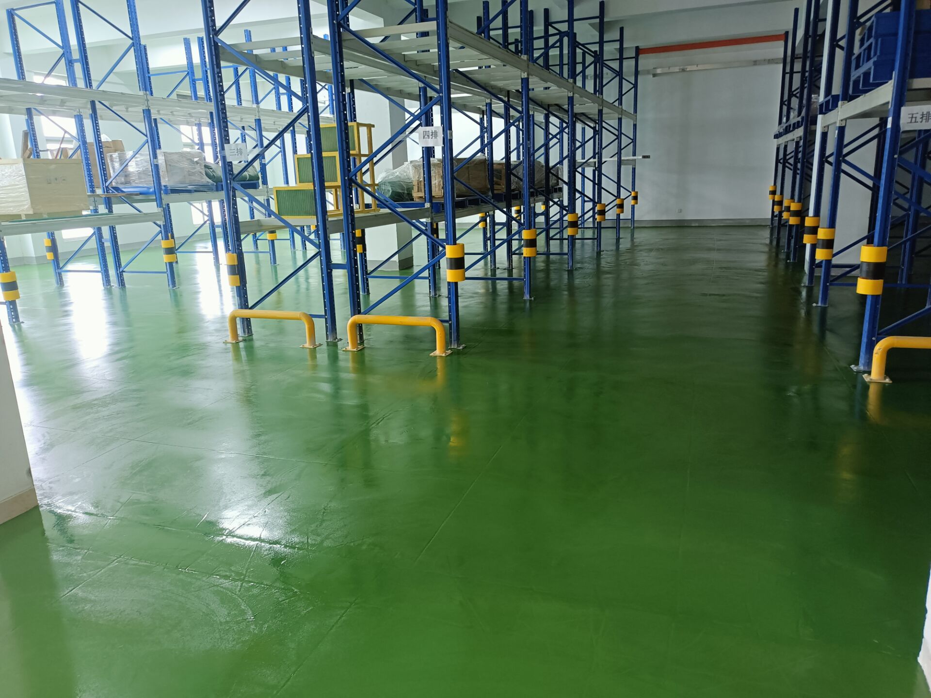 在倉儲(chǔ)系統(tǒng)中,貨物進(jìn)出的搬運(yùn)對(duì)地面的碾壓強(qiáng)度較高,聚氨酯自流平不但起到了亮化環(huán)境的作用,而且硬度夠,此工藝比較適合倉儲(chǔ)環(huán)境使用。