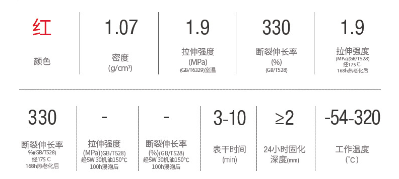 產(chǎn)品描述:紅色,長期耐溫320℃,短期耐溫370℃,固化速度快,可粘接金屬、玻璃等多種材質(zhì),適用于高溫工況的密封與粘接。