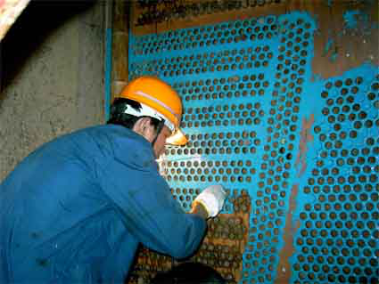 施工內(nèi)容:1、將管板腐蝕析碳后變成的泥狀物質(zhì)徹底清除,管板必須露出金屬光澤。