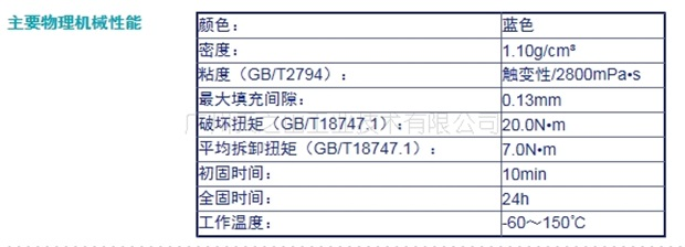 中高強(qiáng)度,觸變性粘度,耐化學(xué)介質(zhì)性能好,可在輕油表面使用,建議用于M6~M20的螺紋緊固件的鎖固、密封,可用普通工具拆卸。